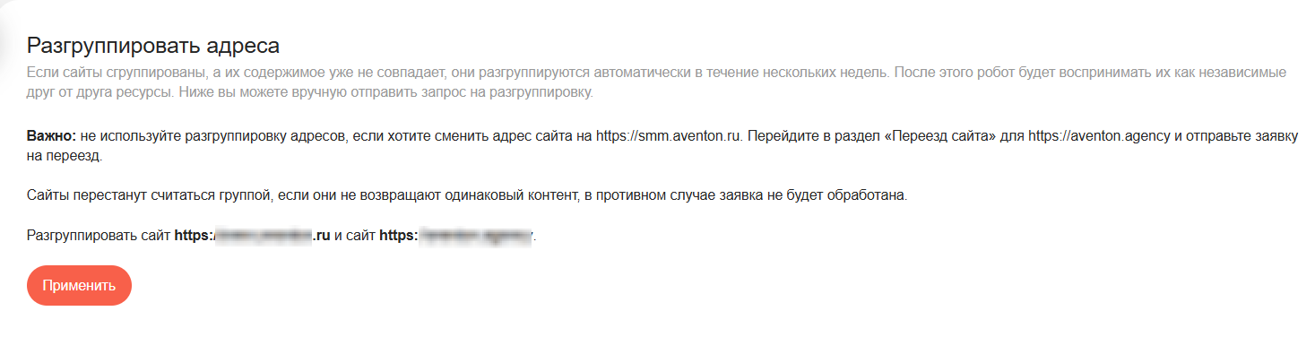 Добавьте новый адрес в Яндекс.Вебмастер. Например, если переходите на https://xxx.ru, убедитесь, что он добавлен в панель и не склеен с другими зеркалами. Если что-то не так, используйте инструмент «Разгруппировать адреса».